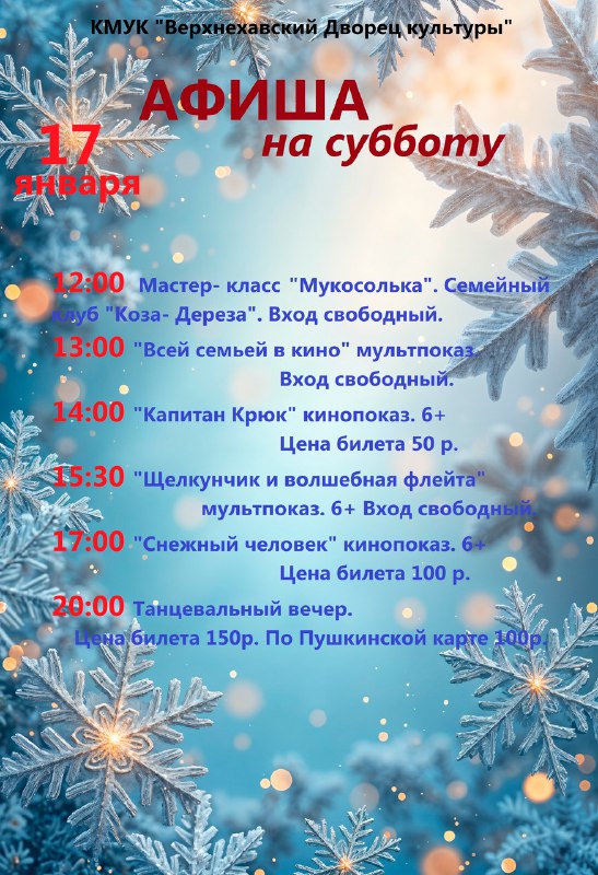 17 января в Верхнехавском Дворце культуры состоятся кино и мультпоказы, будет работать семейный клуб "Коза-дереза", а также вас ждет зажигательный танцевальный вечер! Берите с собой хорошее настроение и проведите выходные насыщено и интересно.