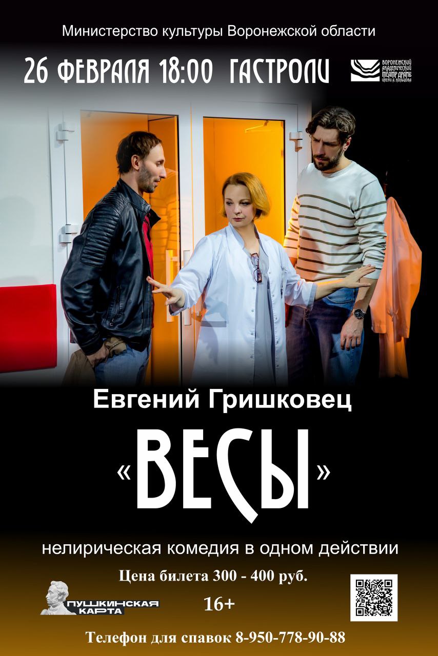 26 февраля 2026 года в 18:00 на сцене Верхнехавского Дворца культуры состоится нелирическая комедия "Весы" 16+ Воронежского государственного академического театра драмы имени А. Кольцова.